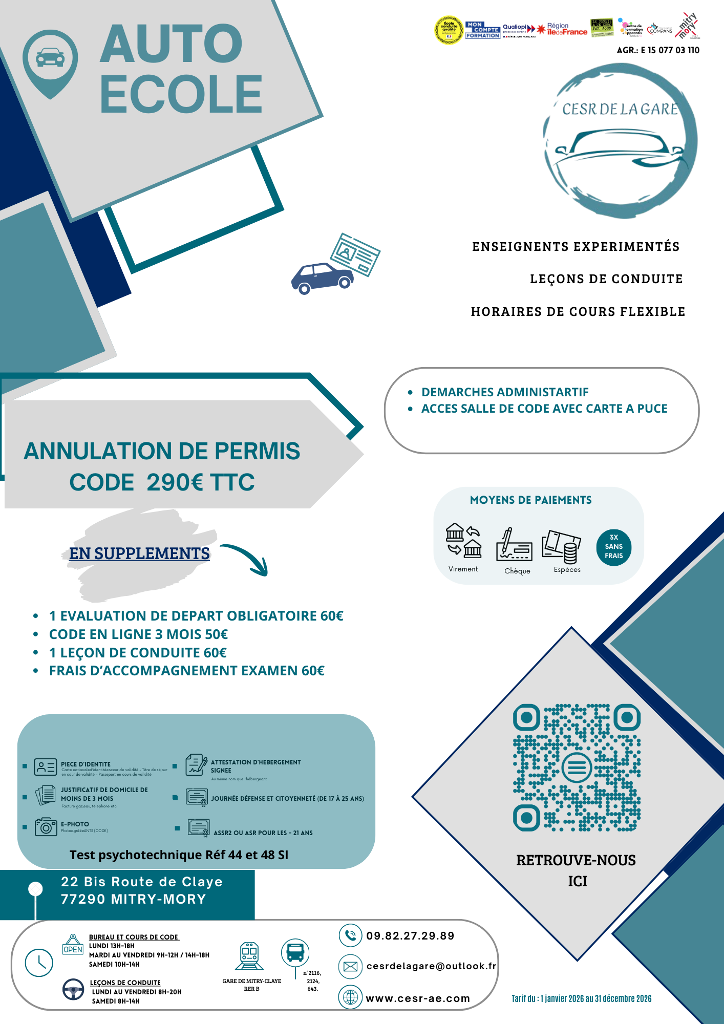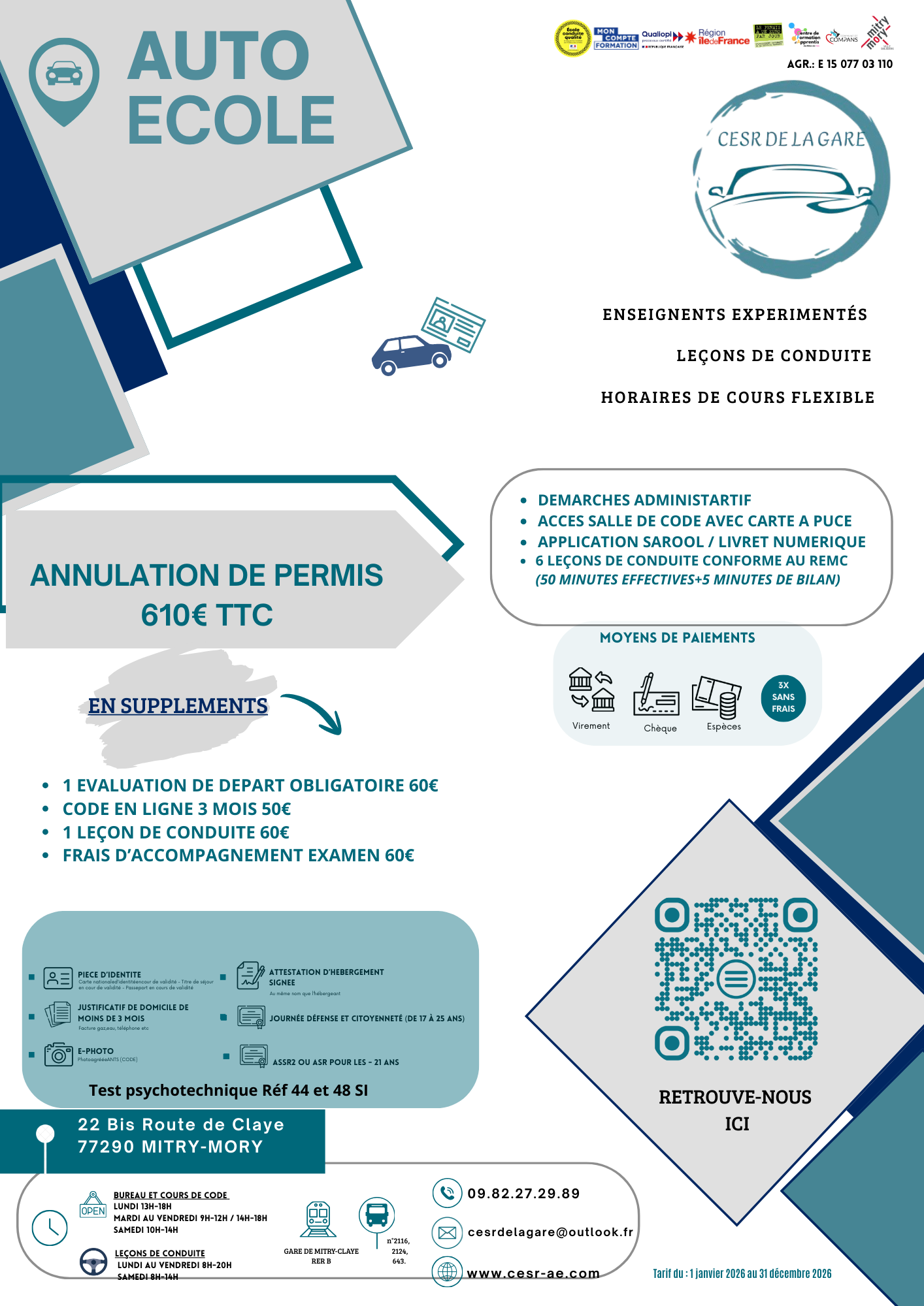 - 6 leçons de conduite conformes au REMC (55 min effectives)