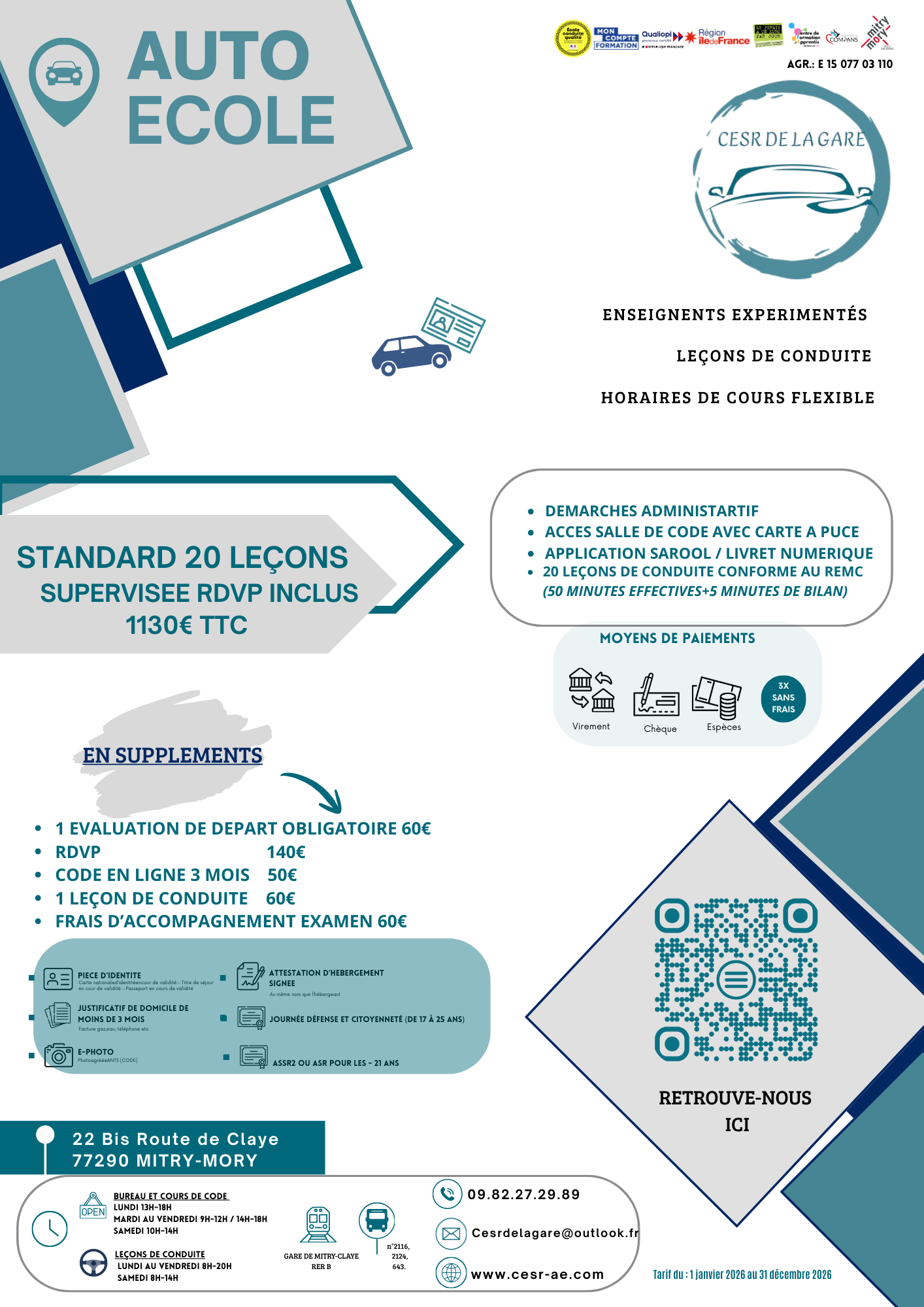 • 20 leçons de conduite conformes au REMC (50 minutes effectives + 5 minutes de bilan).